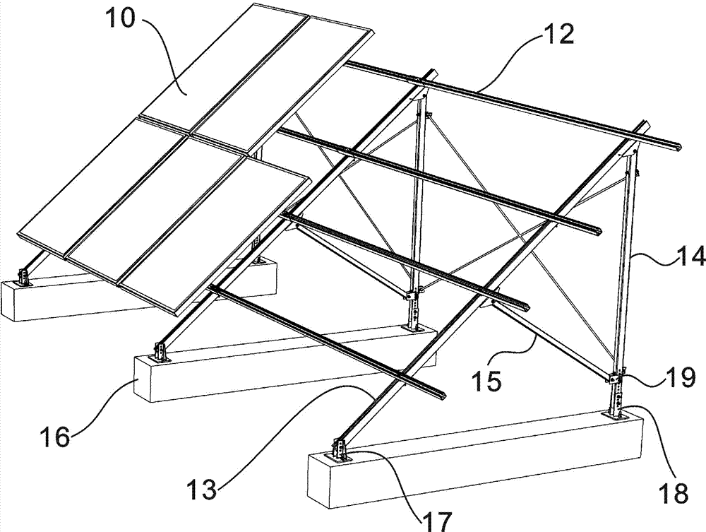 為了滿足較大規(guī)格電池組件的安裝要求,并且可以在風(fēng)速較大的地區(qū)使用,設(shè)計了一種地面加強結(jié)構(gòu),該支架系統(tǒng)可以根據(jù)需要調(diào)節(jié)水平角度,安裝該系統(tǒng)時,不需要進行現(xiàn)場施焊,按照我們提供的裝配圖紙,將螺栓安放在相應(yīng)的螺栓孔當(dāng)中,就可以完全安裝。