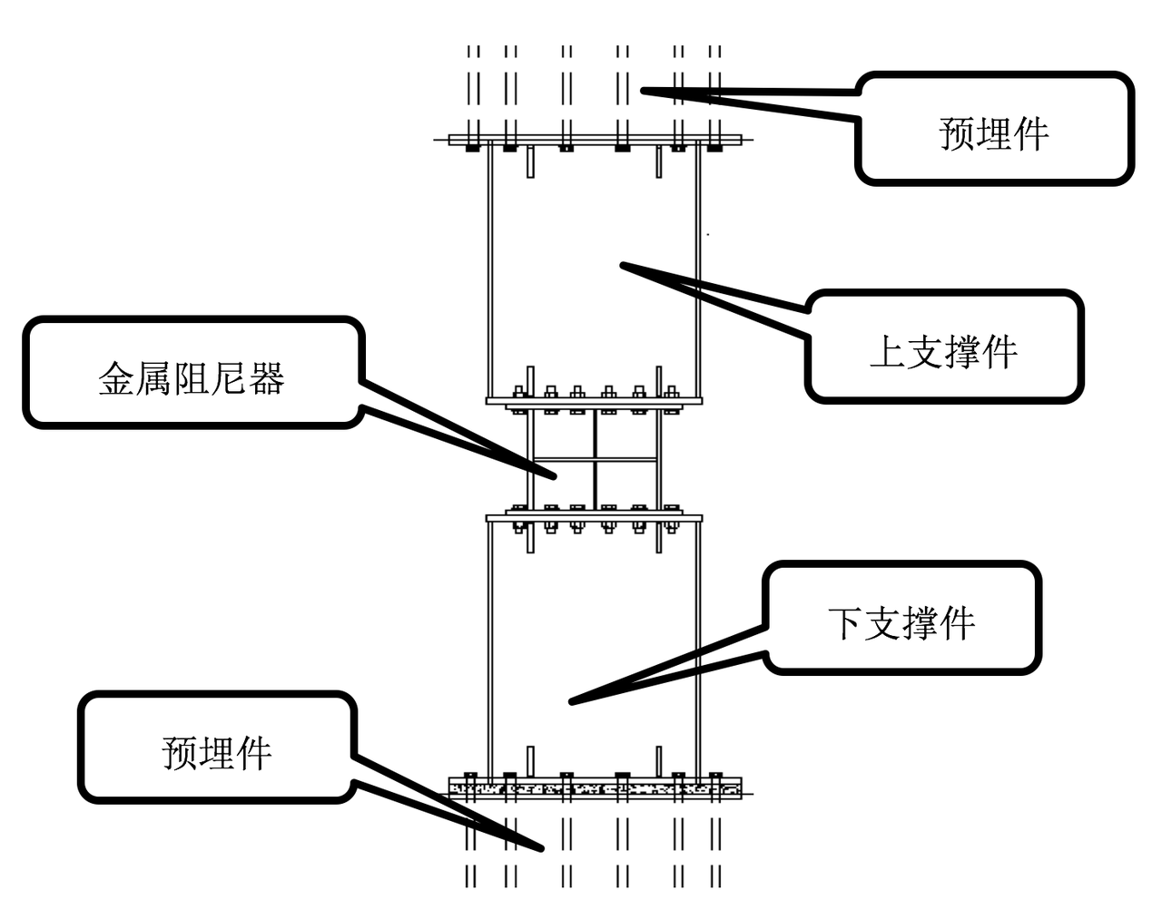 上、下支撐件與預(yù)埋件固定,金屬阻尼器通過螺栓固定在支撐件上后段焊加固。